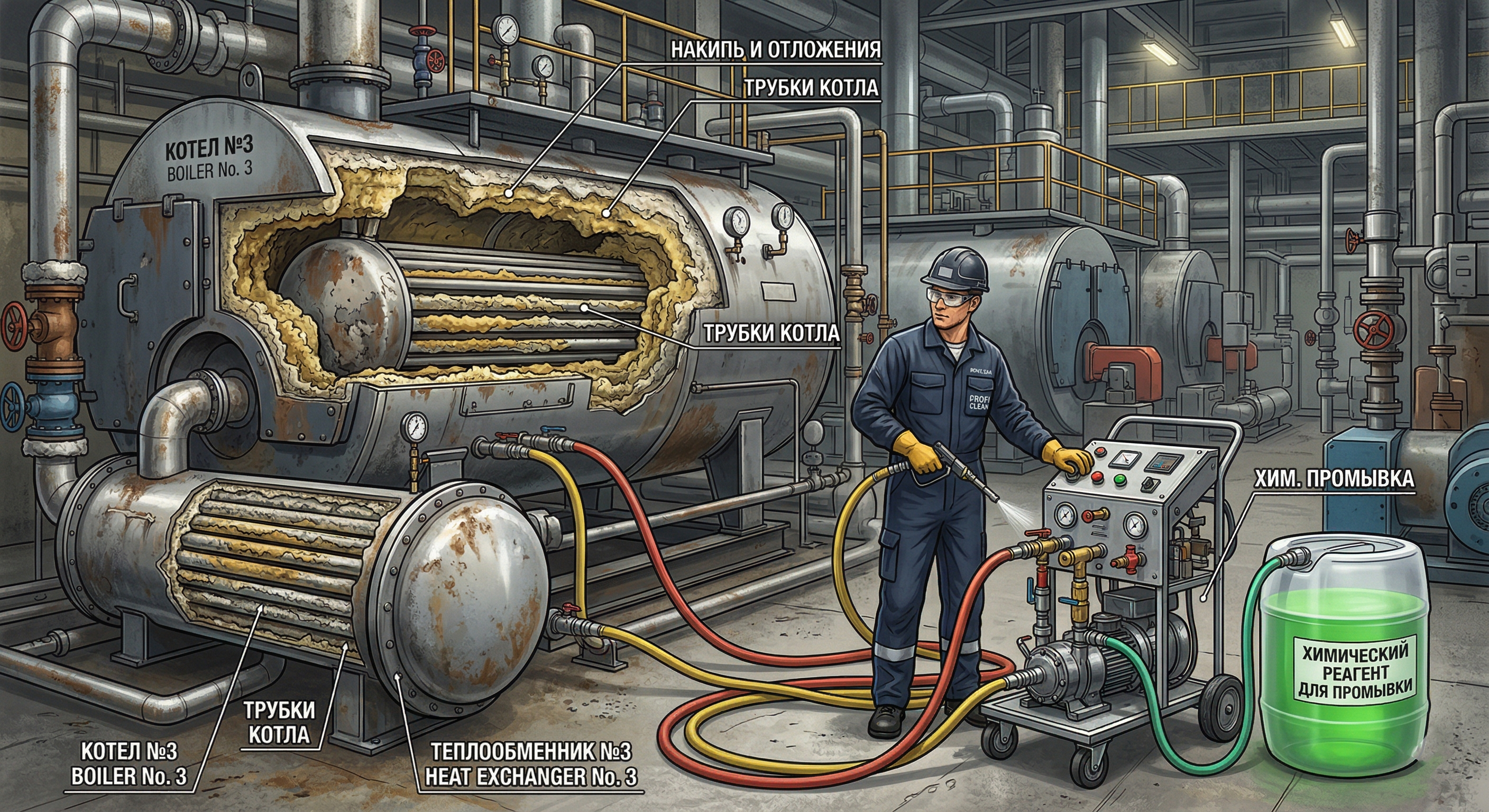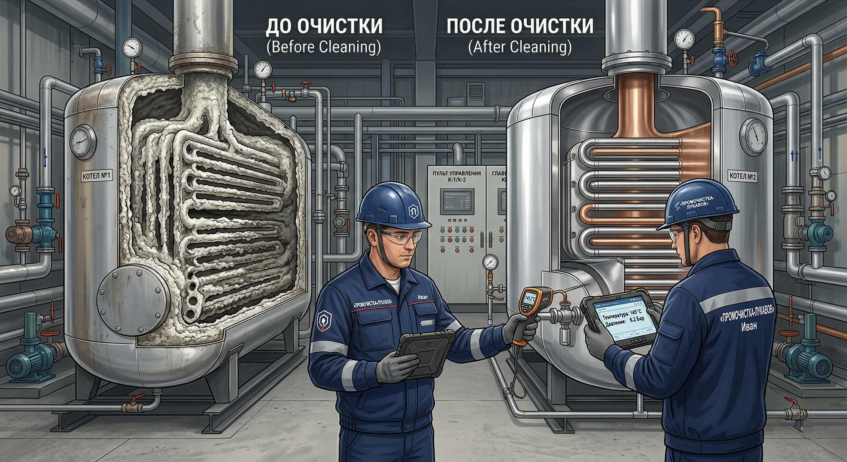 Профессиональная промышленная очистка котлов и теплообменников играет ключевую роль в поддержании эффективной работы котельного оборудования на предприятиях, в котельных жилых комплексов и промышленных объектов. Без регулярной очистки котлов и теплообменников накипь, шлам и коррозийные отложения постепенно ухудшают теплообмен, увеличивают расход топлива и повышают вероятность аварийных ситуаций. Промышленная очистка котлов и теплообменников — это не просто профилактика, а экономически оправданная мера, которая помогает сохранить высокий КПД системы и снизить эксплуатационные затраты.