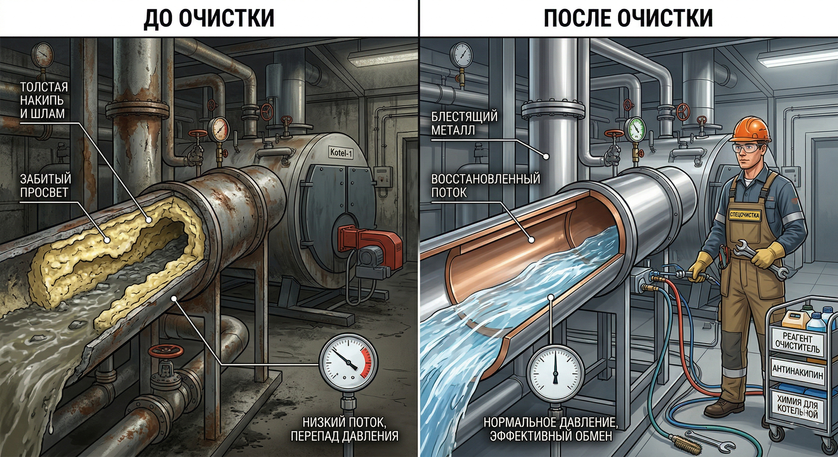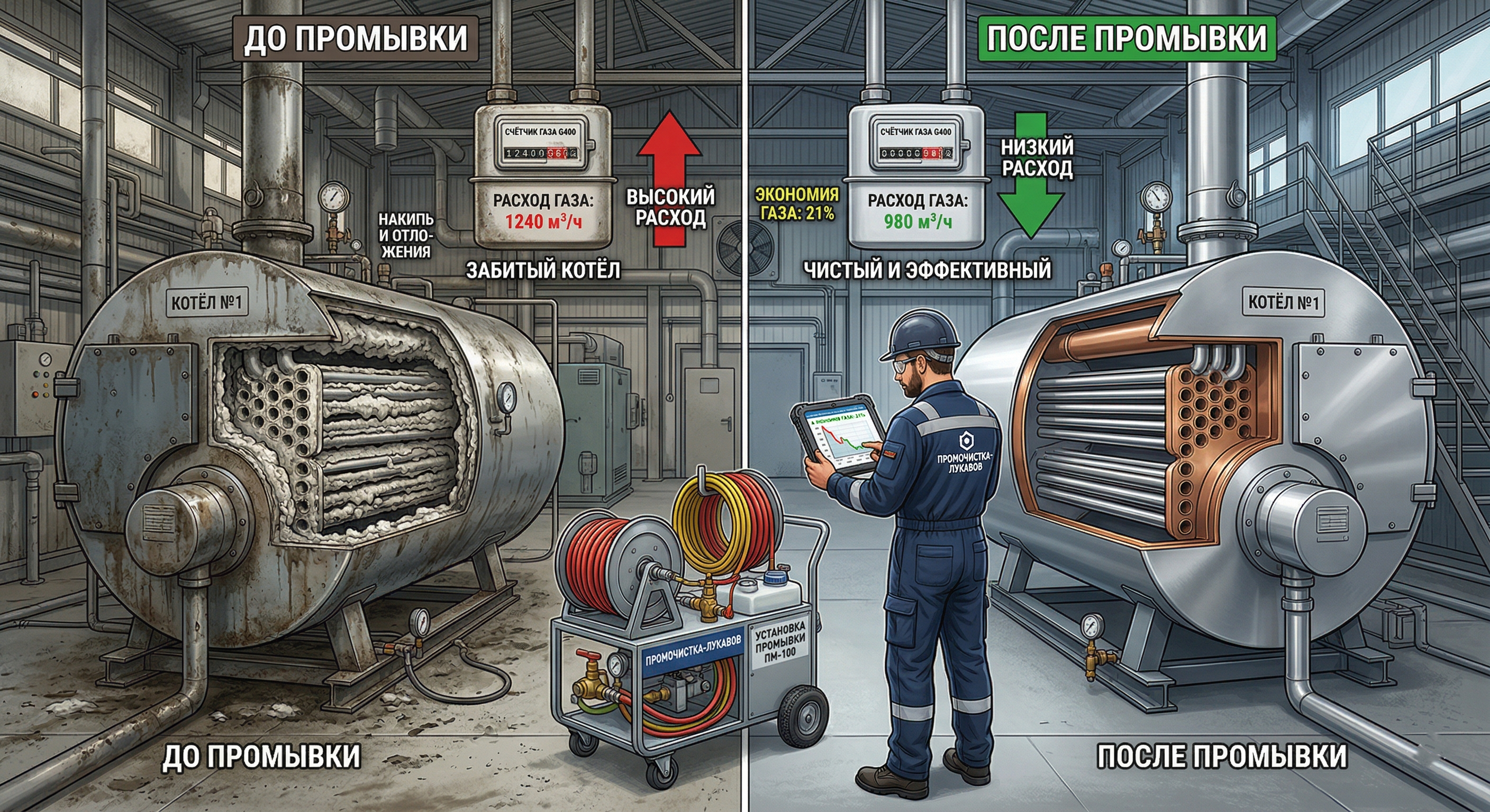 Регулярная промывка котлов и теплообменников — это не просто профилактика аварий, а реальный инструмент энергосбережения. Когда внутри котлов и теплообменников накапливаются накипь, ржавчина и шлам, теплообмен ухудшается, котлу приходится расходовать больше топлива, чтобы нагреть тот же объём теплоносителя. В результате повышается расход газа или другого энергоносителя, а затраты на эксплуатацию системы отопления и водоснабжения быстро растут. Как экономить на топливе и энергии за счёт регулярной промывки котлов, становится особенно очевидно на объектах, где котельная работает круглосуточно.