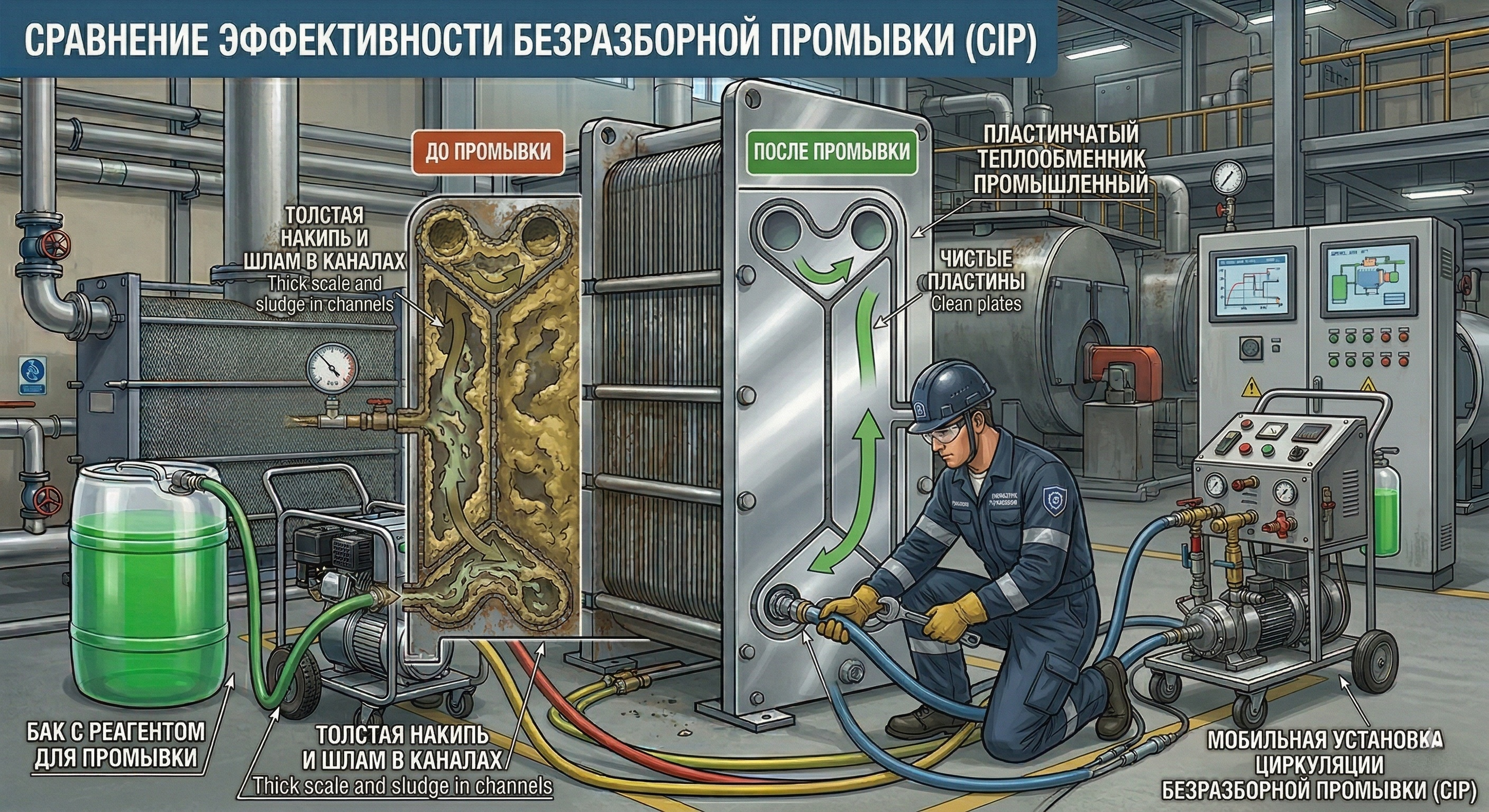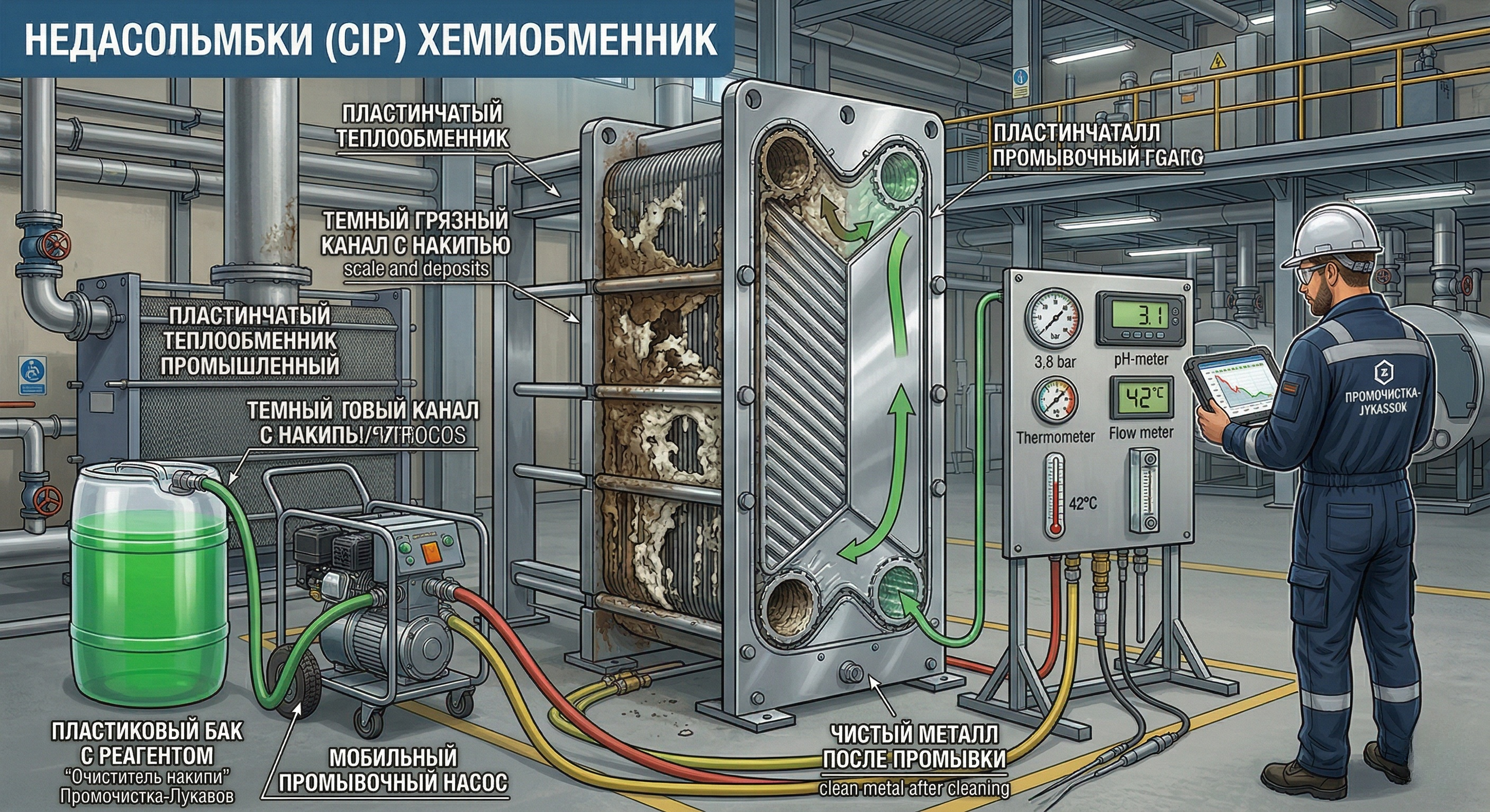 Химическая промывка теплообменников — это метод очистки, при котором внутренние поверхности промываются специальными химическими растворами без разборки самого оборудования. В отличие от механической чистки, химическая промывка позволяет добраться до труднодоступных каналов и удалить накипь, коррозионные отложения, биоплёнку и шлам, не повреждая конструкцию теплообменника. Принцип химической промывки теплообменников основан на химической реакции между реагентом и отложениями: накипь и ржавчина растворяются, после чего вымываются из системы циркуляционной водой.