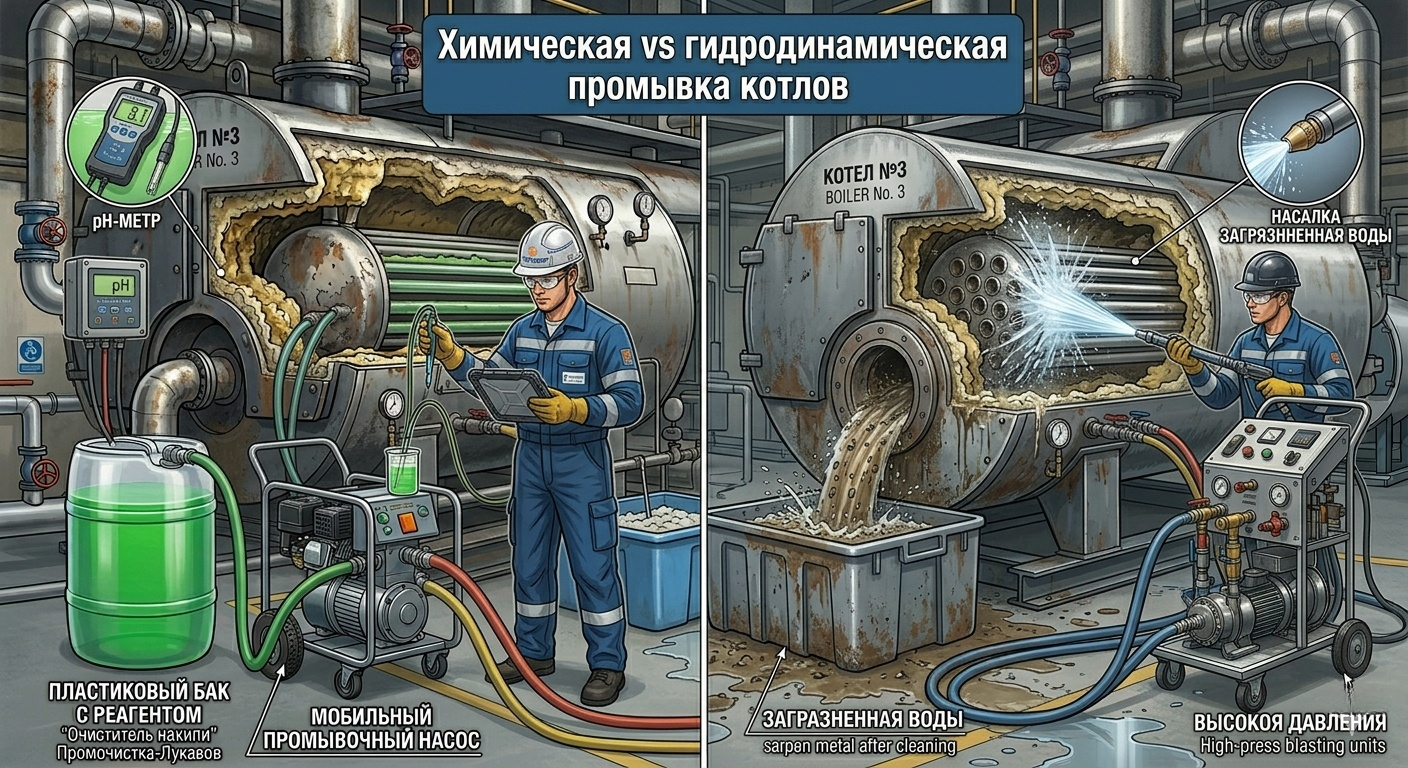 Химическая и гидродинамическая промывка котлов — это два основных способа очистки теплообменников и внутренних контуров, каждый из которых имеет свои сильные стороны и ограничения. Выбор между ними зависит от типа котла, состава и плотности отложений, а также от требований к безопасности, экологии и срокам работ. Сравнение химической и гидродинамической промывки котлов помогает понять, когда выгоднее использовать тот или иной метод, а когда целесообразно их комбинировать.