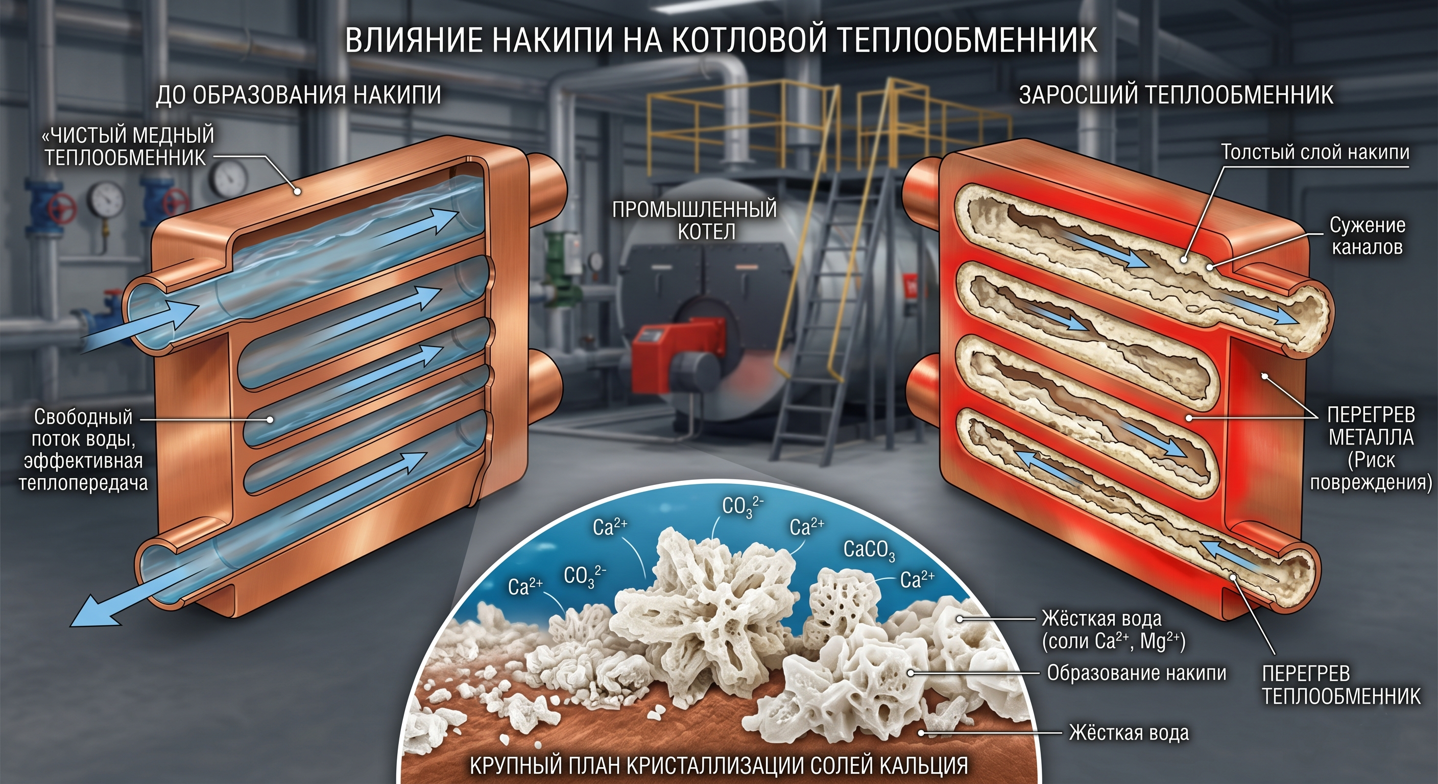 Накипь в котлах и теплообменниках — это твёрдые отложения, состоящие в основном из карбонатов, сульфатов и силикатов кальция и магния, которые образуются из солей жёсткости воды при нагреве. Этот процесс неизбежен в системах отопления и ГВС, где теплоноситель циркулирует по металлическим контурам при температурах 60–95°C. Со временем тонкий налёт превращается в плотный слой, который не только ухудшает теплоотдачу, но и создаёт серьёзные риски для безопасности и долговечности оборудования.